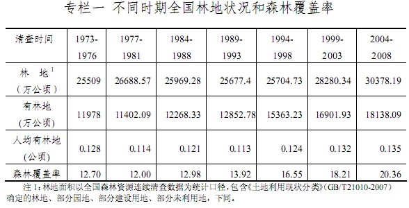 第一章 林地保護(hù)利用面臨的形勢 第一節(jié) 保護(hù)利用現(xiàn)狀 根據(jù)第七次全國森林資源清查(2004-2008 年)結(jié)果,全國林地總面積 30378.19萬公頃,占國土面積的 31.6%;森林覆蓋率 20.36%。林地中,有林地 18138.09萬公頃,灌木林地 5365.34萬公頃,疏林地 482.22萬公頃,未成林造林地 1132.63萬公頃,苗圃地 45.4 萬公頃,跡地(含采伐跡地和火燒跡地)709.61 萬公頃,宜林地 4403.54萬公頃,林業(yè)輔助用地 101.36萬公頃。  黨中央、國務(wù)院一直高度重視生態(tài)建設(shè)和林業(yè)發(fā)展,各級政府認(rèn)真貫徹落實(shí)《中華人民共和國森林法》等有關(guān)法律法規(guī)和黨中央、國務(wù)院的林業(yè)發(fā)展方針、政策,林地保護(hù)利用取得了明顯成效。 ——促進(jìn)了國土綠化和森林資源持續(xù)增長。我國森林覆蓋率已從新中國成立初期的8.6%提高到20.36%。 森林面積達(dá)到19545萬公頃,比改革開放初期增長 61%;森林蓄積量達(dá)到 137億立方米,比改革開放初期增長 34%。尤其是近 20 年來,森林面積和蓄積實(shí)現(xiàn)了持續(xù)增長。人工林面積達(dá) 6169 萬公頃,居世界第一位,占全球人工林面積的 38%。僅“十五”期間,全國植樹造林面積就達(dá) 3993萬公頃。 ——實(shí)現(xiàn)了局部生態(tài)明顯改善。改革開放以來,國家先后實(shí)施了“三北”防護(hù)林、天然林保護(hù)、退耕還林、京津風(fēng)沙源治理等重點(diǎn)生態(tài)工程。 “三北”防護(hù)林工程造林 2400多萬公頃,工程 區(qū)森林覆蓋率提高了1倍。 天然林保護(hù)工程有效保護(hù)天然林9500多萬公頃,減少森林資源消耗 4.26 億立方米。退耕還林工程造林 2600 多萬公頃,其中退耕地造林 900 多萬公頃,工程區(qū)森林覆蓋率提高兩個(gè)多百分點(diǎn)。全國沙化面積由 20 世紀(jì)末的年均擴(kuò)展約 3436平方公里變?yōu)槟壳暗哪昃s減約 1283平方公里, 總體上實(shí)現(xiàn)了從“沙逼人退”向“人逼沙退”的歷史性轉(zhuǎn)變。 ——保護(hù)了生態(tài)區(qū)位重要地區(qū)的林地資源。2001 年以來,共區(qū)劃界定國家級公益林地 10500多萬公頃, 中央財(cái)政每年支出的公益林補(bǔ)償費(fèi)已超過 30 億元;建立了各類自然保護(hù)區(qū)總面積 達(dá) 12200多萬公頃,約占國土面積的12.7%;已建森林公園 2151處,總經(jīng)營面積 1597.47萬公頃,有效保護(hù)了全國生態(tài)區(qū)位重要地區(qū)的林地及生物多樣性。新中國成立以來,國務(wù)院確定了重點(diǎn)國有林區(qū),并建立了一批國有林業(yè)局;還先后建立了 4466 個(gè)國林地相關(guān)概念及劃分標(biāo)準(zhǔn)林地:根據(jù)《中華人民共和國森林法實(shí)施條例》,林地包括郁閉度 0.2以上的喬木林地以及竹林地、灌木林地、疏林地、采伐跡地、火燒跡地、未成林造林地、苗圃地和縣級以上人民政府規(guī)劃的宜林地。 有林地:連續(xù)面積大于 0.067hm2、郁閉度 0.2 以上、附著有森林植被的林地,包括喬木林地和竹林地。 灌木林地:由灌木樹種或因生境惡劣矮化成灌木型的喬木樹種以及胸徑小于 2cm 的小雜竹叢組成,以經(jīng)營灌木林為目的或起防護(hù)作用,連續(xù)面積大于0.067hm2、覆蓋度在30%以上的林地。其中:國家特別規(guī)定灌木林地(特灌林地):具有一定經(jīng)濟(jì)價(jià)值,以取得經(jīng)濟(jì)效益為目的進(jìn)行經(jīng)營的灌木林,或者分布在干旱、半干旱地區(qū)和喬木生長界限以上專為防護(hù)用途,且覆蓋度大于30%的灌木林地。 疏林地: 由喬木樹種組成, 連續(xù)面積大于0.067hm2、 郁閉度在0.10-0.19之間的林地。 采伐跡地:采伐后保留木達(dá)不到疏林地標(biāo)準(zhǔn)、且尚未人工更新或天然更新達(dá)不到中等更新等級的林地。 火燒跡地:火災(zāi)后活立木達(dá)不到疏林地標(biāo)準(zhǔn)、且尚未人工更新或天然更新達(dá)不到天然幼苗3000株/hm2以上或幼樹500株/hm2以上的林地。 未成林造林地:造林或封育后不到成林年限,當(dāng)年造林成活率85%以上或保存率 80%(年均等降水量線 400mm 以下地區(qū)當(dāng)年造林成活率為 70%或保存率為 65%)以上,飛播造林后保留苗木 3000 株/hm2以上或沙區(qū)成苗 2500株/hm2以上,封育地天然幼苗 3000 株/hm2以上或幼樹 500 株/hm2以上,分布均勻,尚未郁閉但有成林希望的林地。 苗圃地:固定的林木、花卉育苗用地。 宜林地:經(jīng)縣級以上人民政府規(guī)劃為林地的土地。包括宜林荒山荒地、 宜林沙荒地和其他宜林地。 郁閉度:單位面積喬木樹冠垂直投影面積之和,用十分?jǐn)?shù)表示。 森林覆蓋率:一定行政區(qū)域范圍內(nèi)有林地與特別規(guī)定灌木林地面積占土地總面積的百分率。 有林場,重點(diǎn)林區(qū)的森林資源得到了有效的保護(hù)利用。 ——提高了木材及林產(chǎn)品供給能力。新中國成立 60 年來,累計(jì)為社會(huì)提供木材 60 多億立方米,人造板、地板、家具、松香等林工產(chǎn)品產(chǎn)量居世界首位,經(jīng)濟(jì)林、花卉、紫膠、活性炭等林副林特產(chǎn)品產(chǎn)量居世界前列。2008 年,我國林業(yè)產(chǎn)業(yè)產(chǎn)值達(dá)到 1.44 萬億元,林產(chǎn)品進(jìn)出口貿(mào)易額突破 700 億美元,已躍升為世界林產(chǎn)品生產(chǎn)和貿(mào)易大國。 但必須清醒地看到,我國目前仍然存在人多林少、人與林地關(guān)系緊張的矛盾,林地